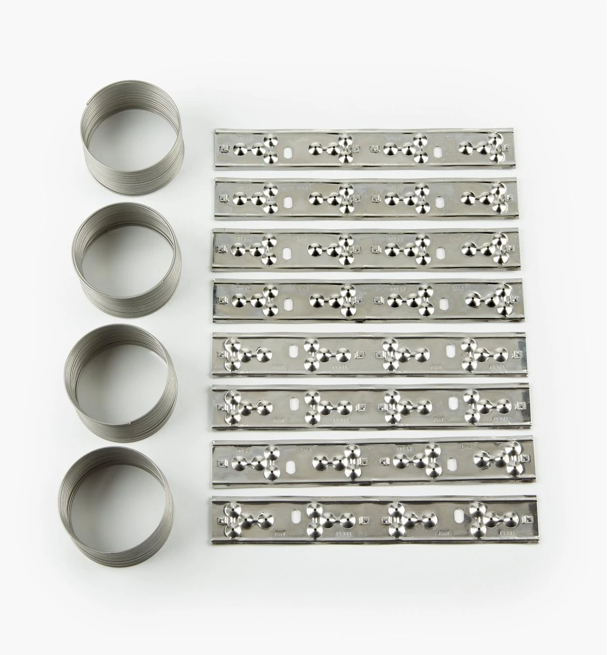 The package includes four sections of coil, each of which stretches to cover up to 48″, for a total length of 16′. Eight mounting brackets (two per section) are included; they mount permanently with screws or silicone glue you supply. All parts are stainless steel for rust resistance.