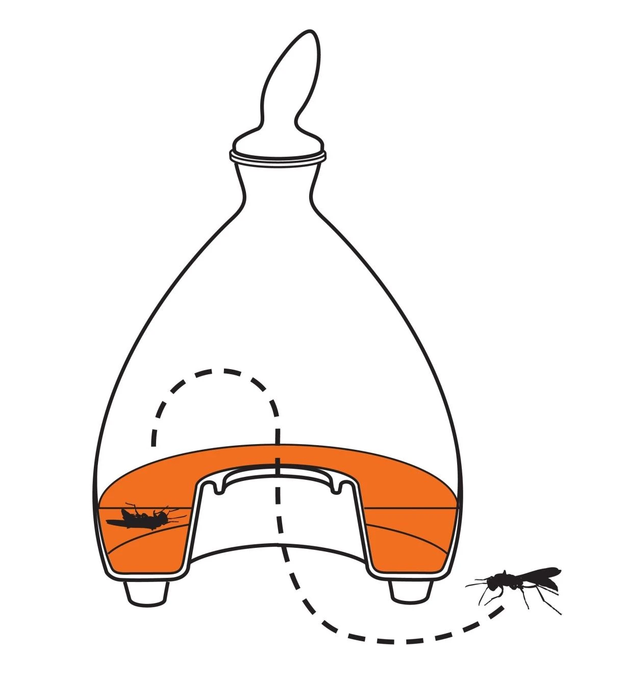 This is an attractive and effective trap for wasps, hornets, yellow jackets and flies. Made in Europe from recycled glass, the heavy walls make it almost shatterproof. Just add lemonade, sweetened iced tea or other sweet liquid and replace the stopper. The insects will fly into the hole in the base and then into the liquid, where they get trapped and eventually drown.