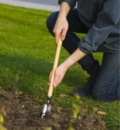 A convenient length for working in raised beds or from a seated or kneeling position, this medium-handled bulb planter is made to our specifications and will easily last a lifetime. About 23″ long overall, it lets you reach farther than a typical hand tool while still being easy to maneuver. Its narrow 1 3/4″ wide, 5 3/4″ long blade has a bevelled spear-point tip to penetrate soil easily.