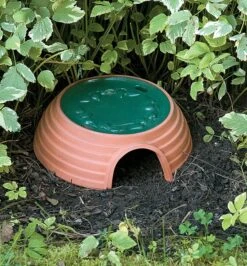 The shelter offers protection from predators; if one tries to enter, the two separate openings ensure that the toad always has an escape route. The openings measure 2 3/4″ high by 4″ wide, large enough for most common North American toads. Two small holes in the roof permit ventilation and help prevent rainwater from pooling on top.