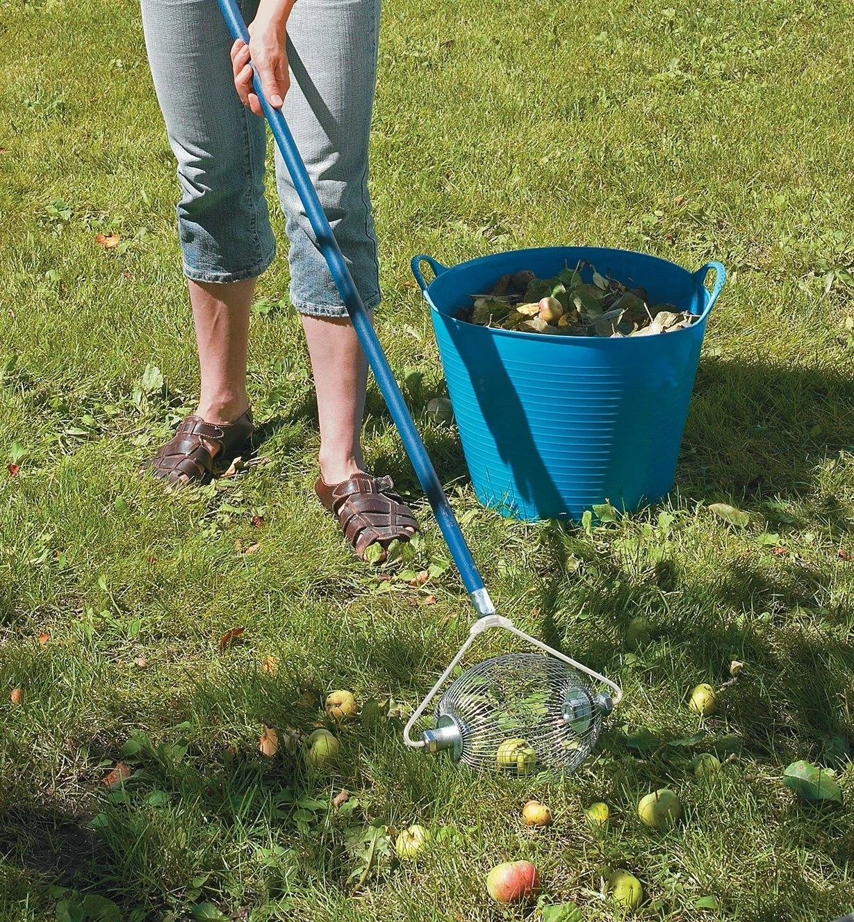 A lawn covered with nuts or crab apples is not only unsightly, but perilous for feet and lawnmowers. This tool collects nuts and fruit with a quick rolling motion. The highly flexible wires in the barrel-like head capture almost any small object. To empty, simply spread the wires at one point and dump the contents.