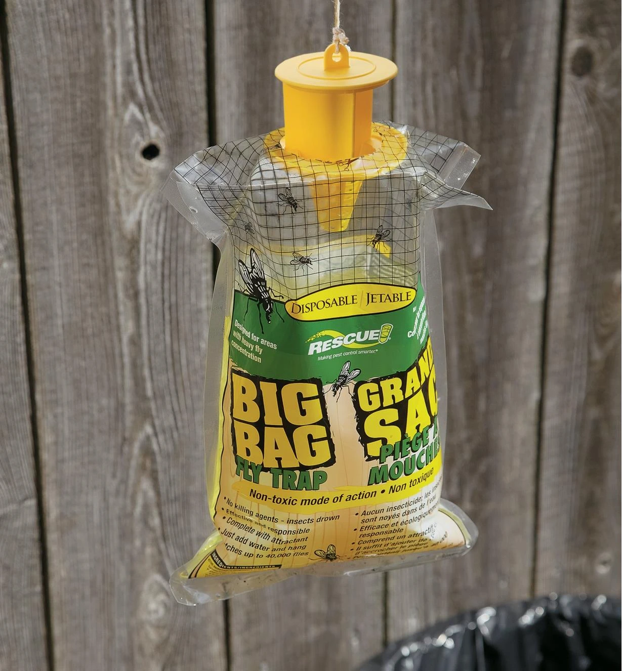 Commonly used in commercial livestock operations, this powerful fly trap uses a non-toxic food-based attractant to entice flies, which enter the bag through the yellow cap and cannot escape. It lures houseflies, cluster flies, blow flies and other common pest flies, but not pollinating insects or other beneficial species.