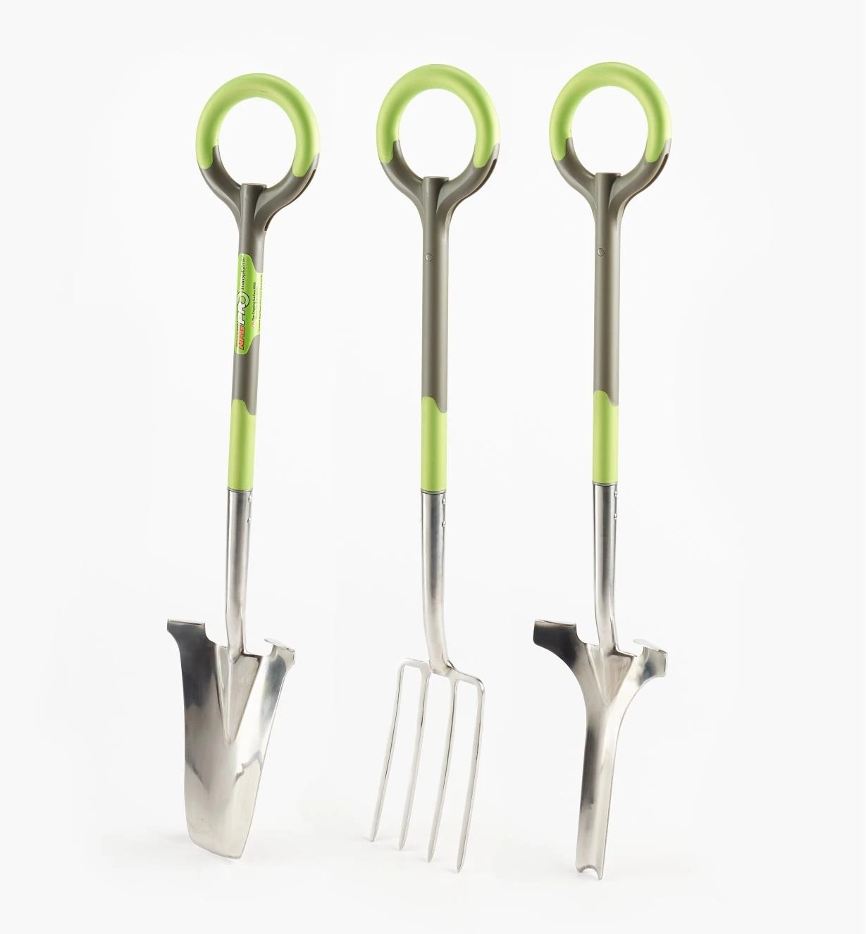 The large, comfortable circular handles allow a greater range of natural hand positions, avoiding wrist strain. The steps on the spade and weeder are larger, higher set and offset slightly from the shaft, to provide a wider surface with better foot registration than traditional steps. The steps are also folded forward and slightly curved (traditional steps fold backward, toward the user, and are straight), which softens the corner to reduce ankle injuries. Last, the angle of the step is slightly greater than the traditional 90° relative to the blade, providing a better push angle.