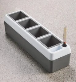 It has four plastic containers that can be lifted out individually, making it easy to transplant herbs purchased in 2 3/4″ square nursery pots directly into them.