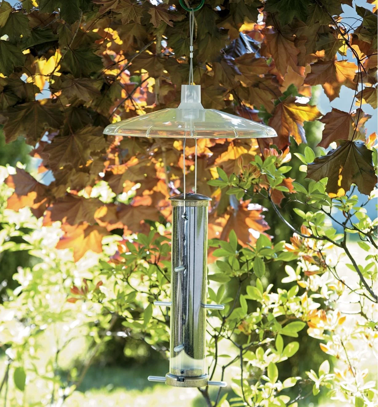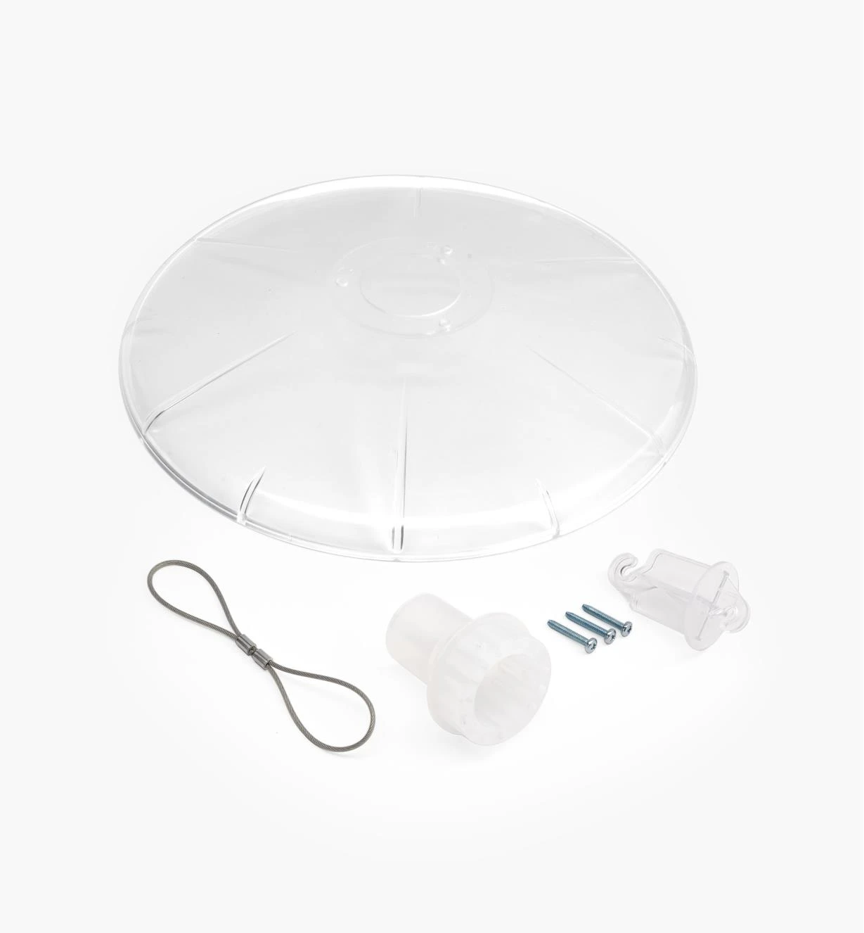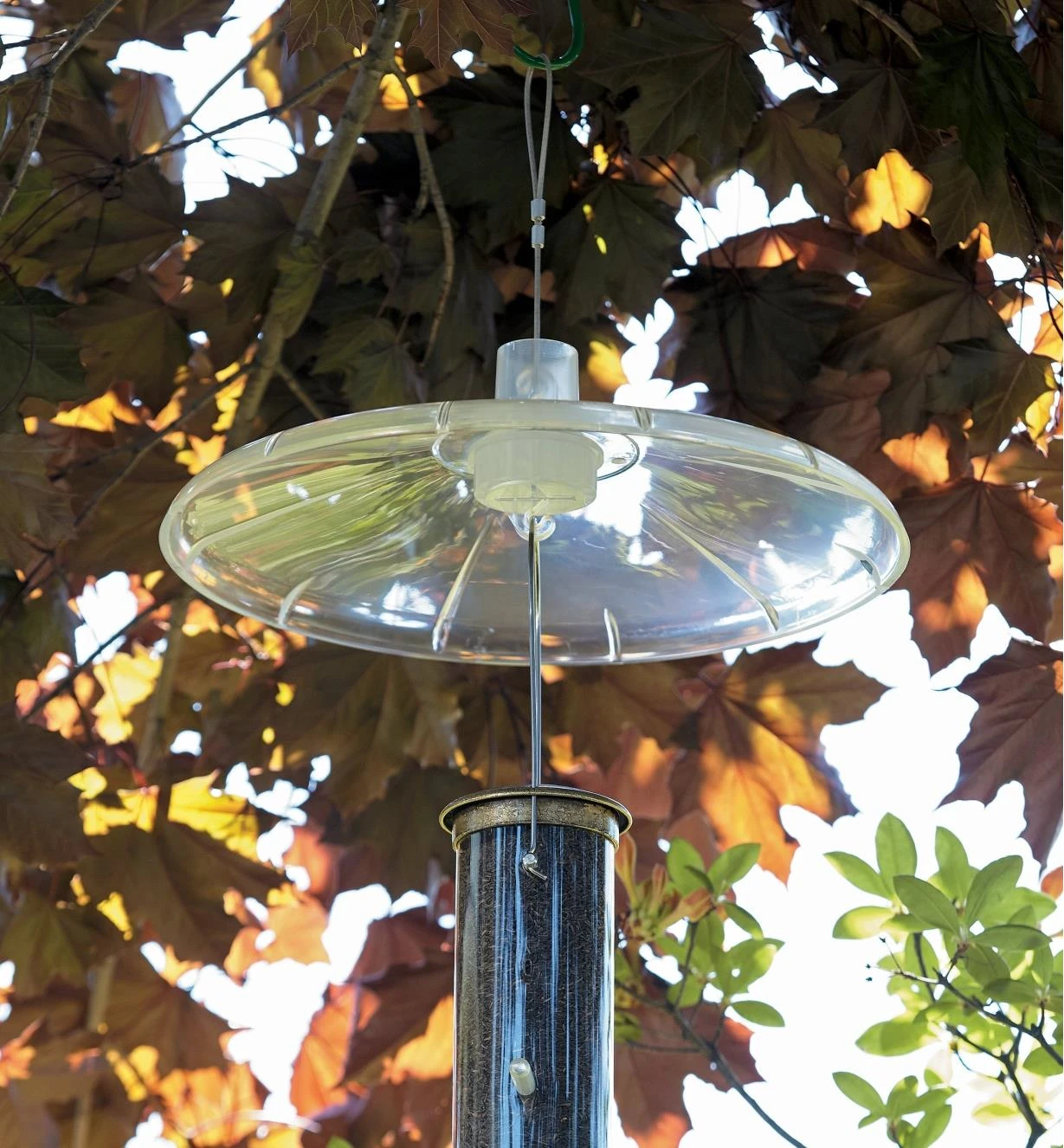 For hanging feeders, an adapter with hooks at both ends fits inside the collar, letting you suspend the baffle by the metal cable and hang the feeder below.