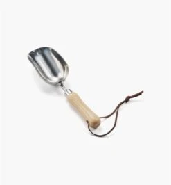 Weighing just 4 oz, it has a 4 1/2″ × 2 3/4″ stainless-steel scoop. Its smooth hardwood handle is easy to hold, with a leather loop for hanging.