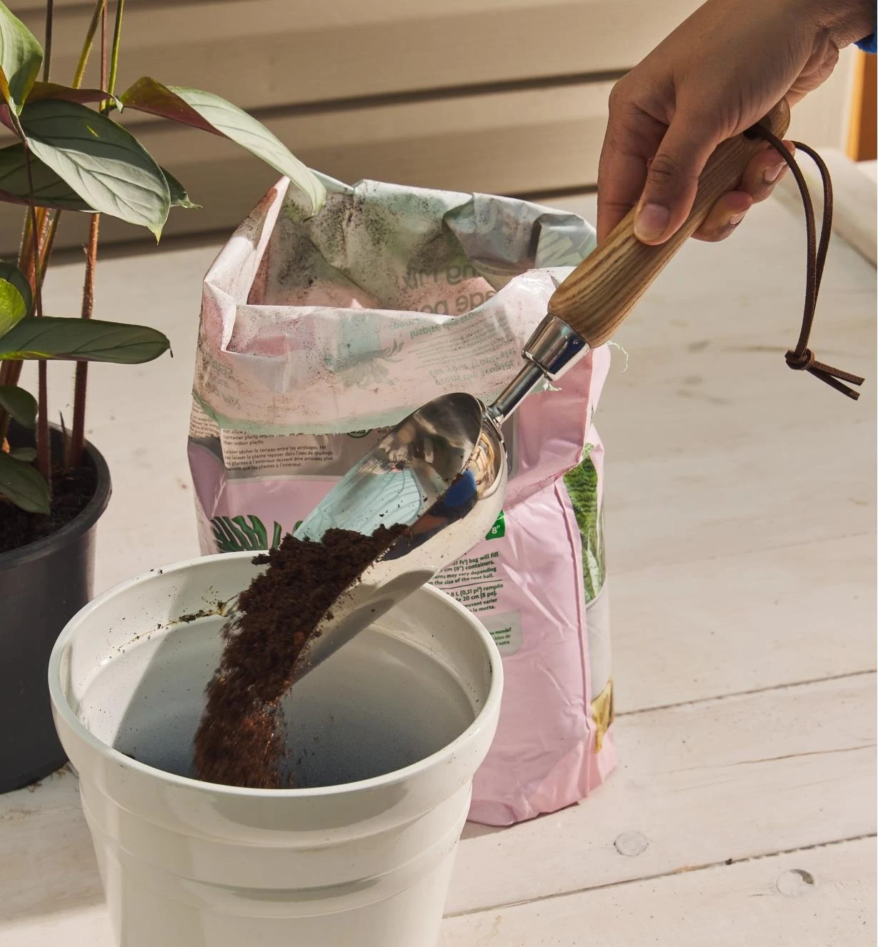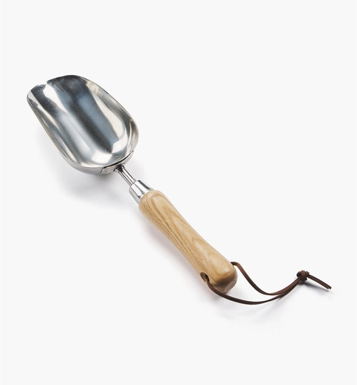 Weighing 7 oz, it has a 6″ × 3 1/2″ scoop made from stainless steel. Its smooth hardwood handle is lightweight and easy to hold, with a leather loop for hanging.