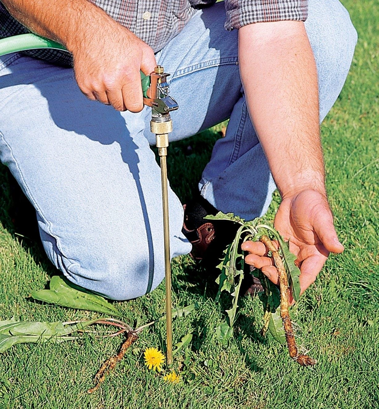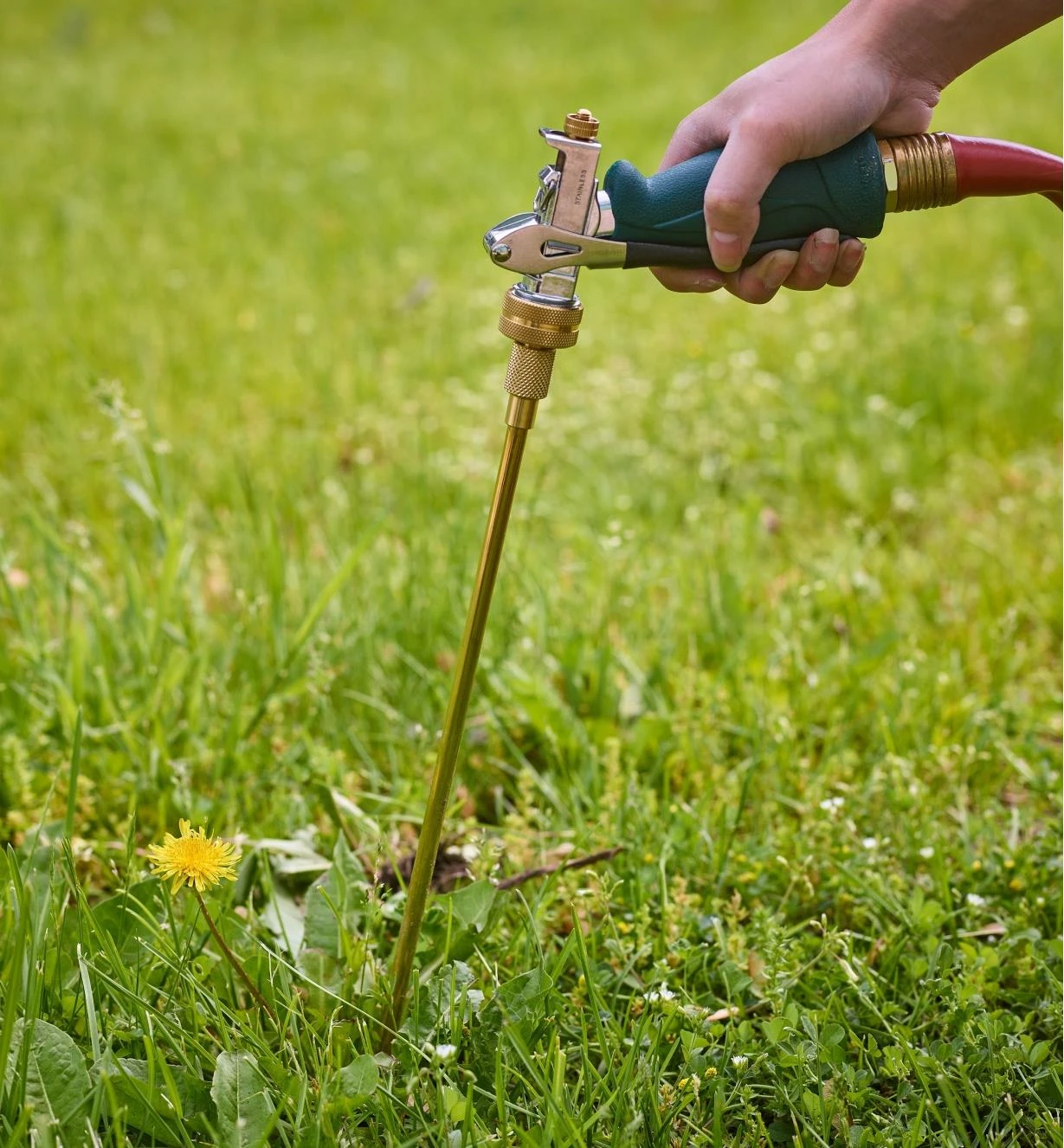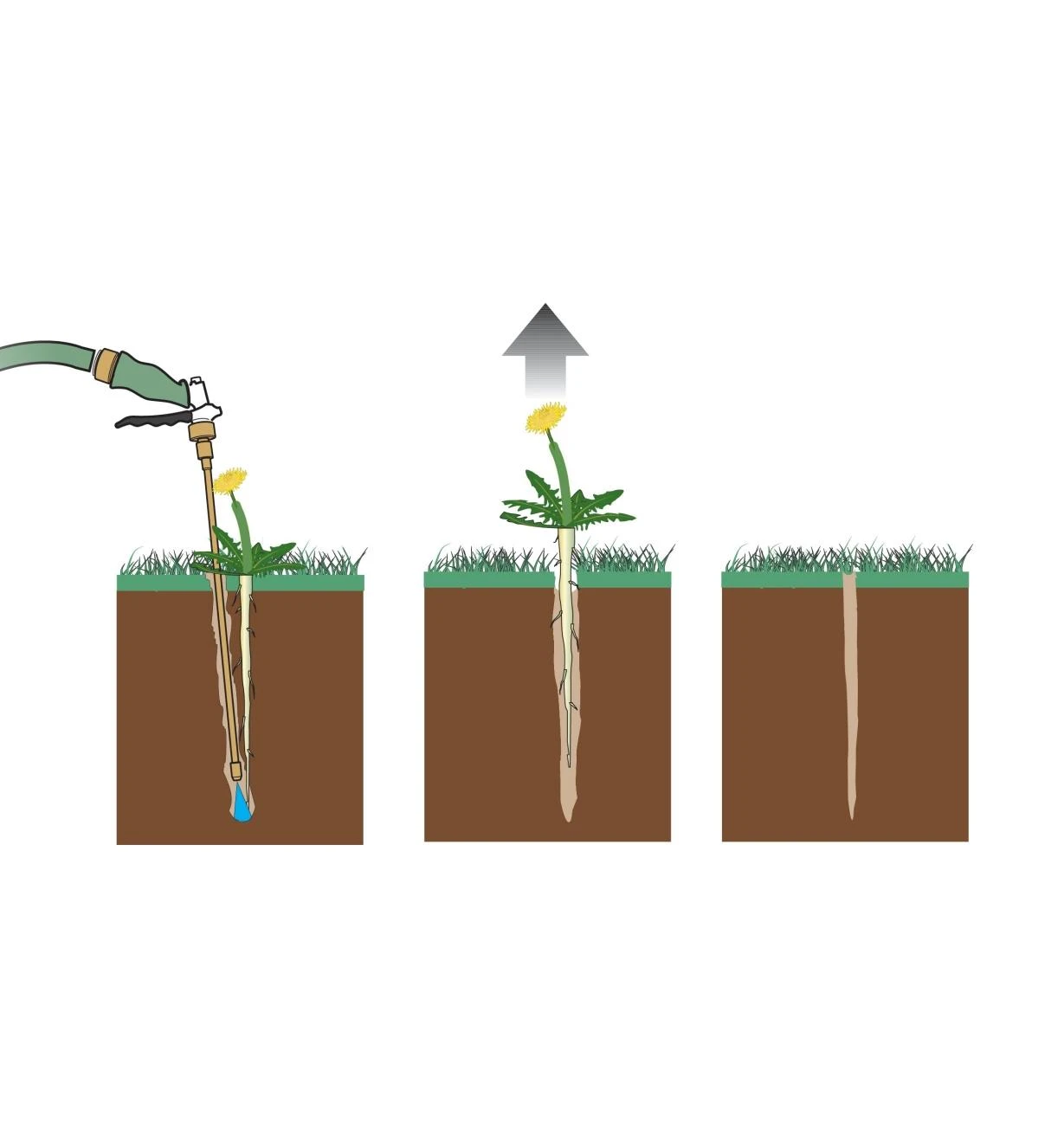 It works by creating a high-pressure stream of water that blasts a hole beside the offending root and makes the root so loose that it almost swims in a mini sea of mud. To use, just squeeze the trigger and gently push the wand down into the ground alongside the root – the water drills the hole with little effort. Within moments the whole weed can be easily plucked out of the ground. As the water soaks into the ground, the hole fills itself in, leaving a smooth-looking lawn. It is as simple as that.